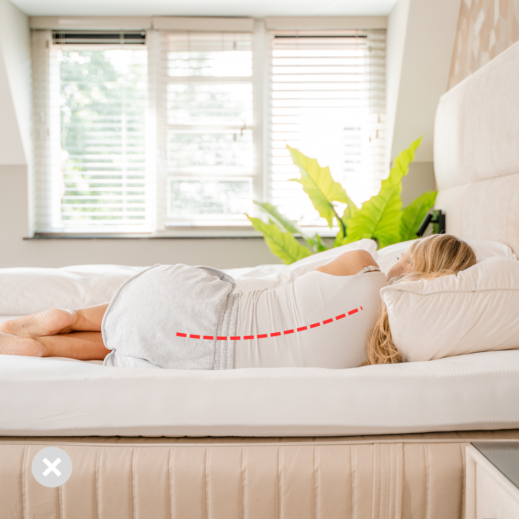 Plaats de Basiq Support onder het midden van je topper, ter hoogte van de heupzone. Dit verwijdert de kuil uit de topper en geeft het lichaam direct weer ondersteuning.